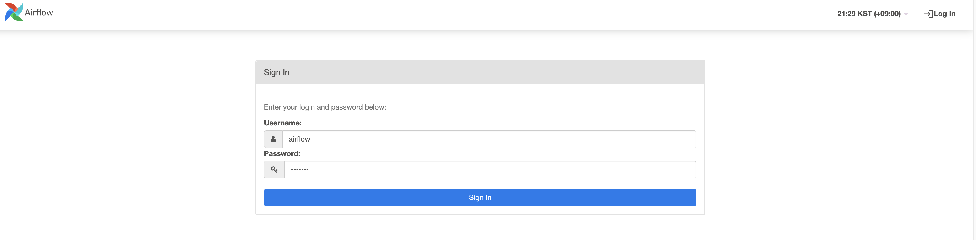 위의 주소로 들어가면, 로그인창이 뜨는데, 놀라지마세요. 초기아이디 및 비밀번호는 모두 airflow 입니다.