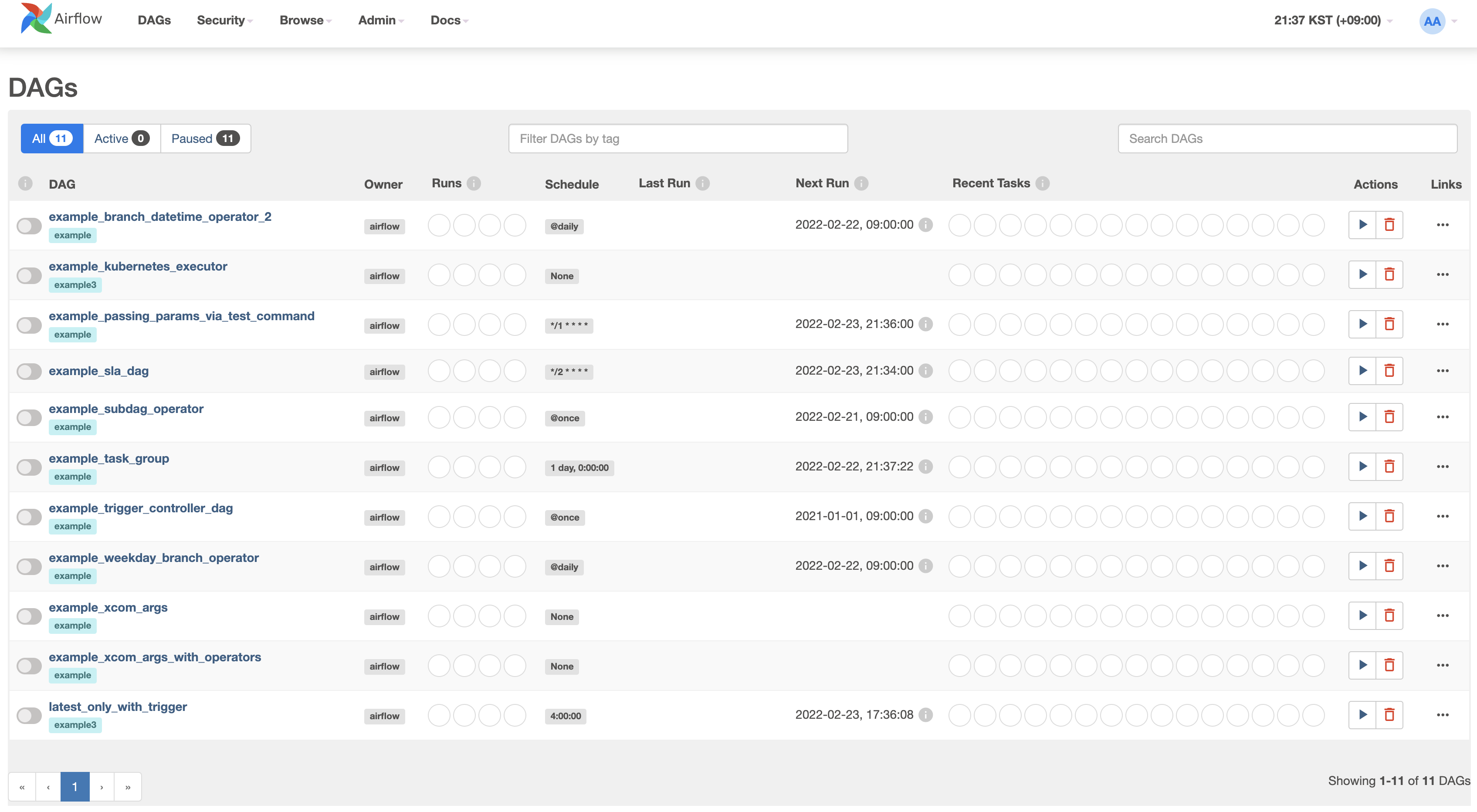 조금 기다리다면 Airflow에 내장되어 있는 튜토리얼 코드들이 보일겁니다. 이것 저것 눌러보면서 익숙해져 보세요.