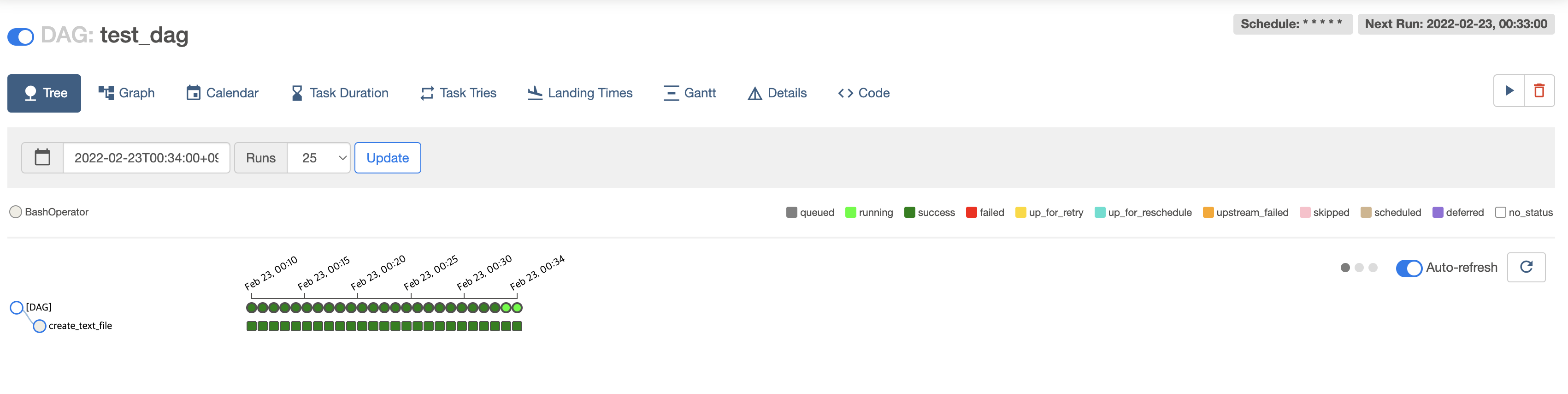 다음과 같이 Tree를 보면 마크를 통해 동작하고 있는지 실패했는지 등을 확인할 수 있습니다. ( 시간설정을 잘해야 하는 것 같습니다. start 시간부터 실행한 이전시간에 동작을 계속 표기해주네요. 실제 프로젝트에서는, 이렇게 매분 동작하게 스케쥴링을 하진 않을 것 같습니다. )
