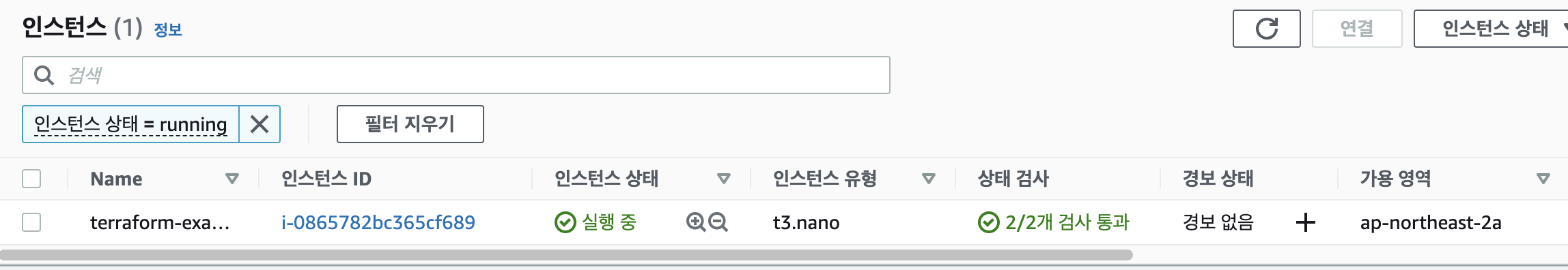 해당 명령이 성공적으로 끝났다면, AWS UI를 통해서 새로운 인스턴스가 생성되었음을 알 수 있습니다.