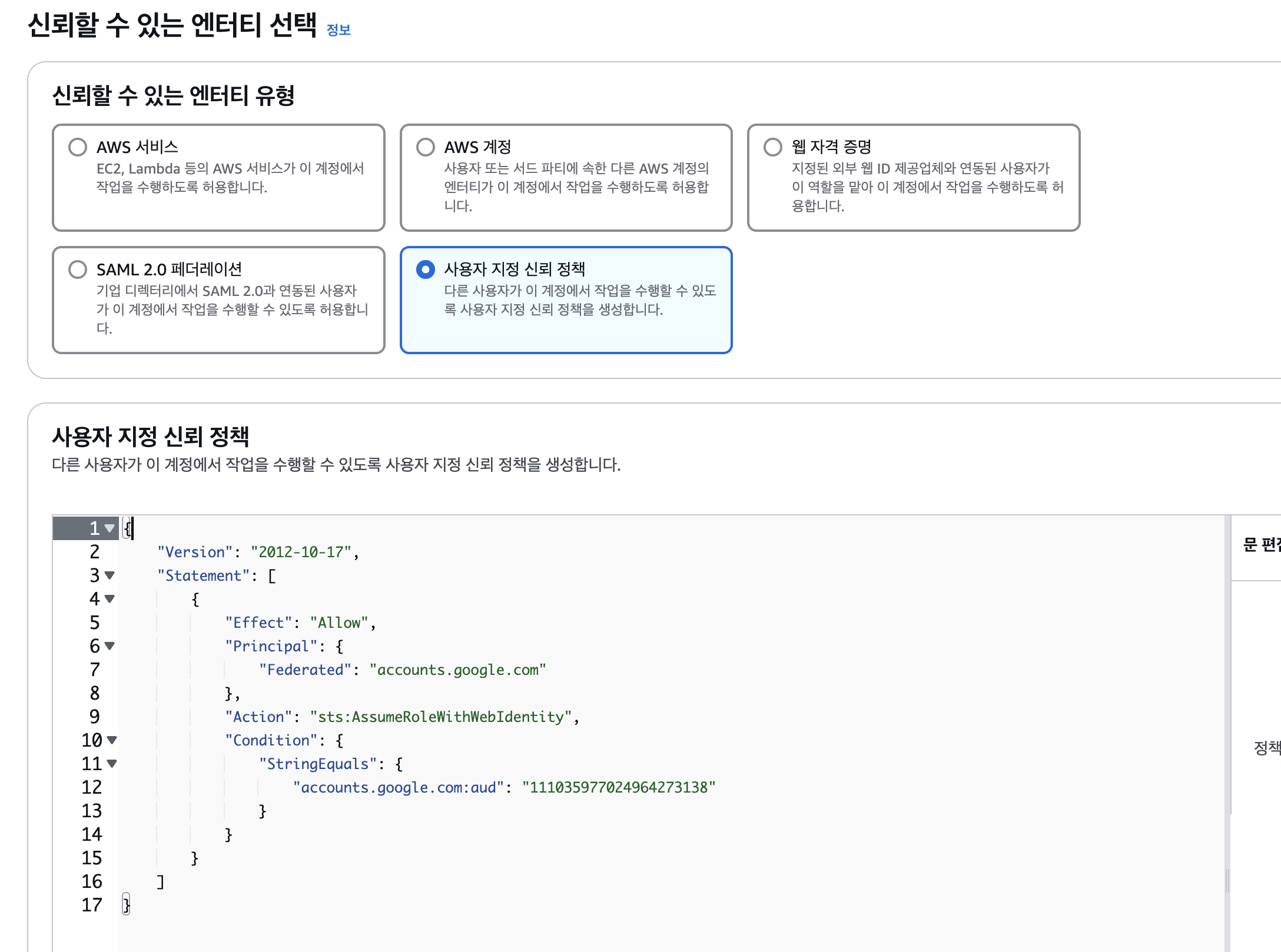 이유는, AWS에서는 GCP와 이미 OICD를 연결해둔 상태라, 따로 연결을 설정하지 않아도 됩니다.