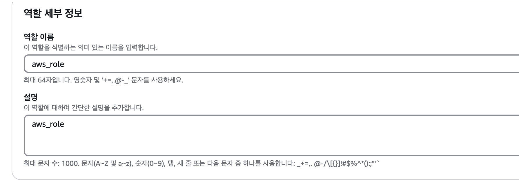 AWS에서는 이전 GCP와 다르게 설정해야하는 것이 많지 않습니다. 연결하고 싶은 IAM Role만 생성하면 완료됩니다.