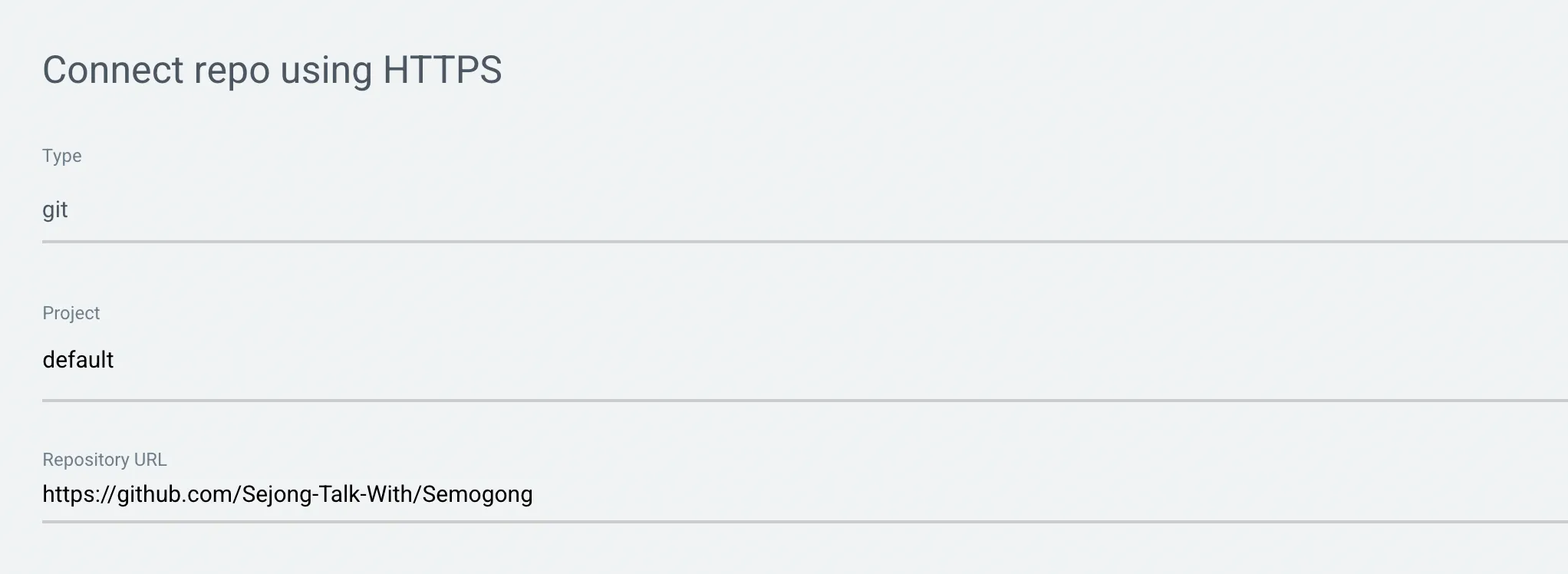 - Repository URL : 사용할 레포지토리 URL , 이전에 연동했던 레포지토리가 등록될 것이다.