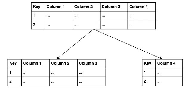위의 분할은 수직 분할입니다. 이전에 정규화로 분할된 상태에서 수직 분할은 한단계 더 나아가 테이블을 분할합니다.