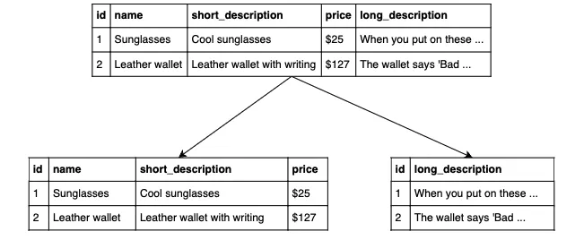 분할 뒤, 공유 키를 통해 연결 할 수 있습니다. 긴텍스트를 포함한 열을 검색에 사용하지 않는다면, 더 적은 데이터를 스캔하므로 쿼리시간이 향상됩니다.