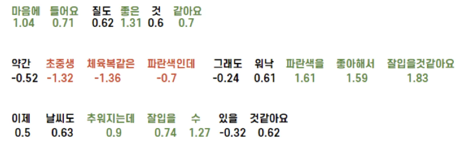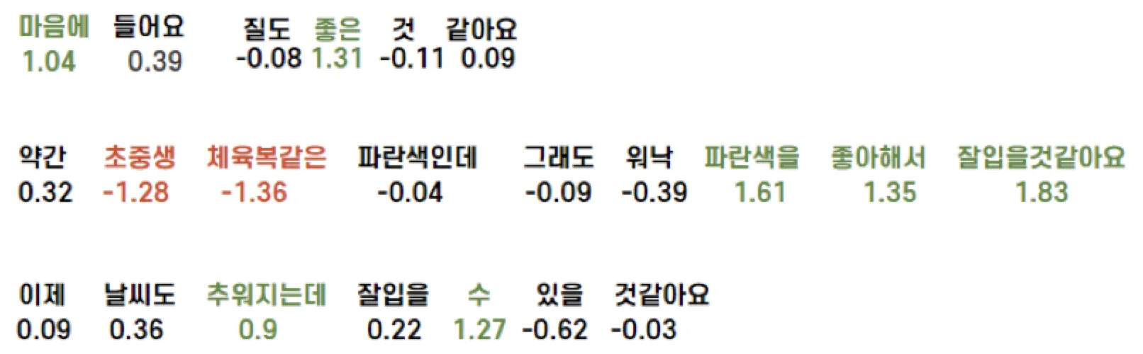 이렇게 하면, 각 단어(이후 형태소 분석기를 역으로 다시 계산해서 단어로 합침)가 끼치는 영향값을 구할 수 있게됩니다.