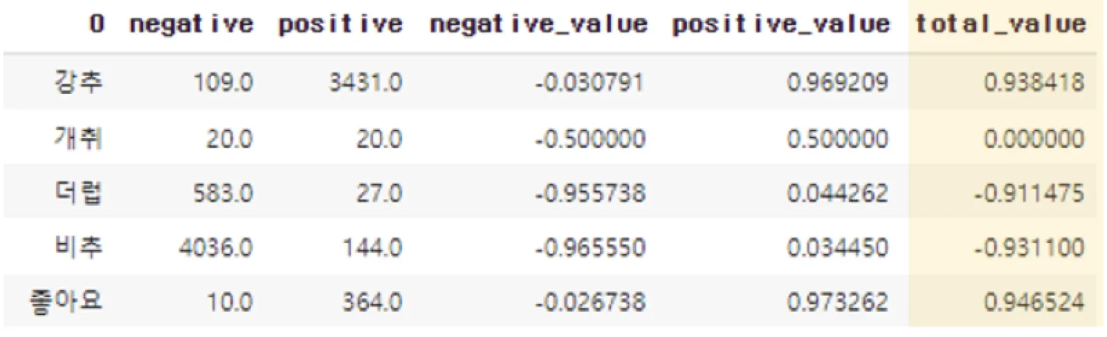 긍정과 부정의 비율을 동일하게 맞췄으므로, 해당 형태소가 긍정에서 나온 비율, 부정에서 나온 비율을 계산하자고 생각했습니다.