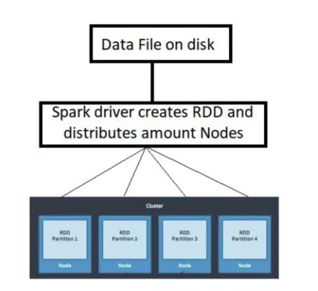 - Spark가 데이터 처리를 시작하면 데이터를 파티션으로 나누고, 각 노드가 데이터 조각을 포함하여 클러스터 노드에 데이터를 분배