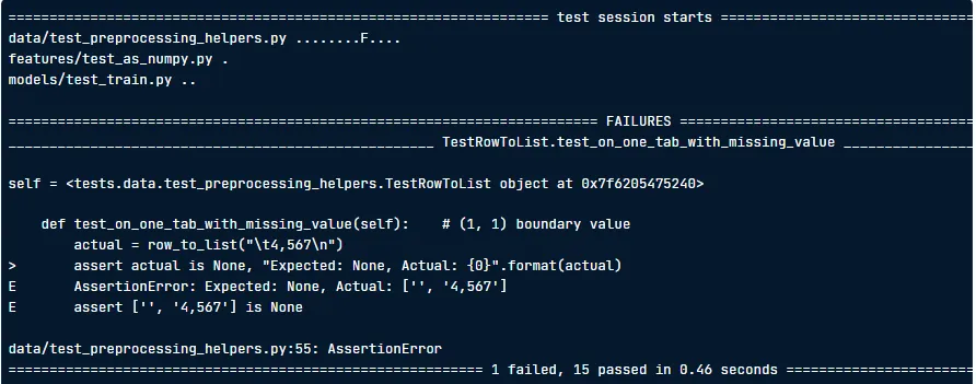 !pytest test_row_to_list.py를 입력하면, 많은 정보가 쏟아져 나옵니다.